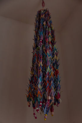 Ich bleibe hier, sitze hier, rosafarbene Wand. Vor mir 1000 Kraniche. Gefaltet von einer liebsten Freundin, als Zeichen und Wunsch für Gesundheit und Hoffnung. Wie oft wäre ich gerne mit den Kranichen in die Ferne geflogen, an den Chemo-Tagen, wenn selbst das Schlafen zu anstrengend war. Raus aus dem Drinnensein, dem Einsamsein, dem Kranksein.